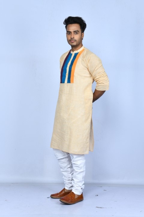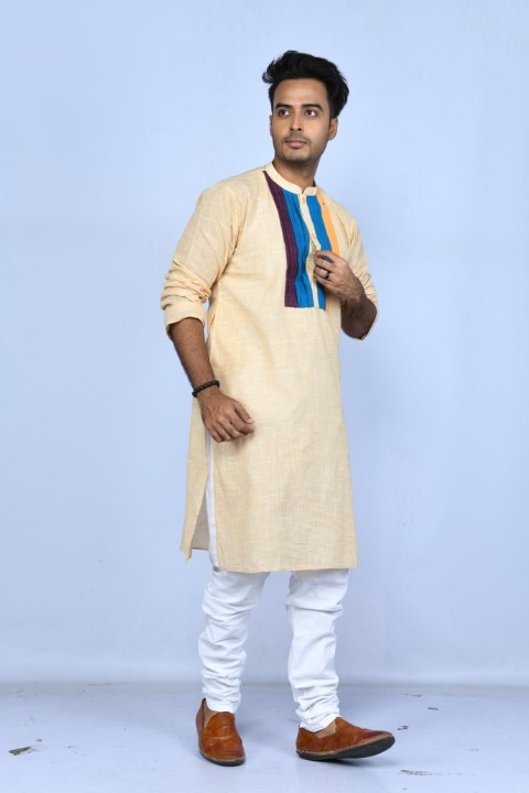 Beige self checkered cotton kurta