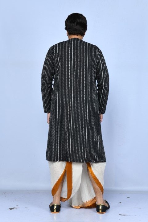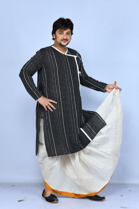 A classic, elegant, versatile contrast kurta in timeless black and white, styled in the traditional angrakha cut. (Dhoti not included in price)