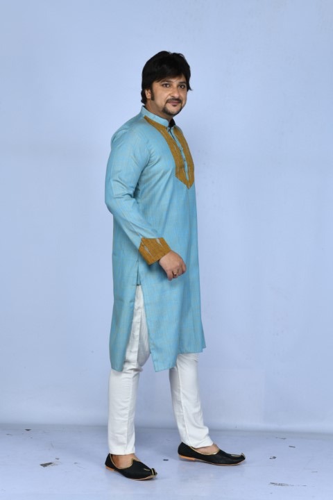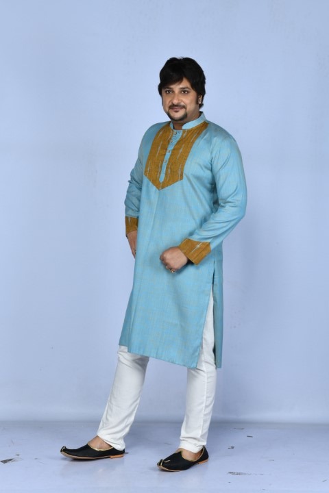 Blue dual tone cotton Kurta with mustard yellow ikkat front yoke and cuff patches
