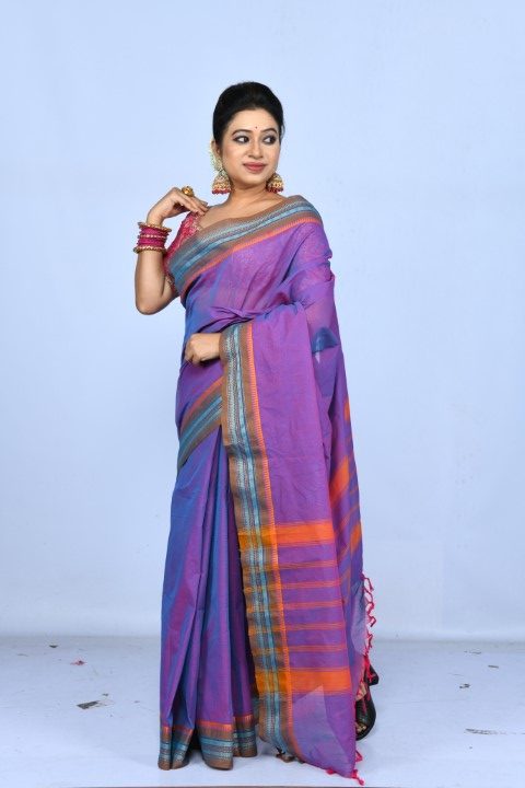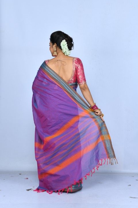 A rich purple handwoven drape, adorned with a very smart green & blue striped border.