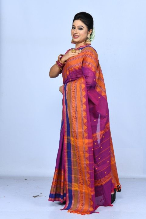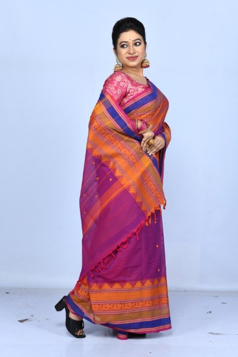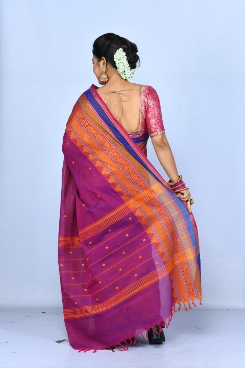 A striking magenta Kanchi cotton saree, handwoven in the classic Kanchipuram tradition. The saree is defined by its broad intricately woven orange border .Perfectly balancing comfort with elegance, this piece is ideal for cultural gatherings, festive occasions, or refined everyday wear.
