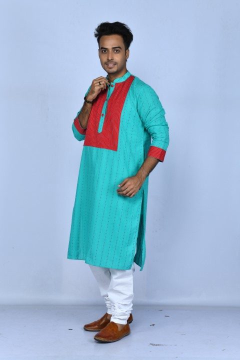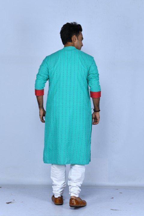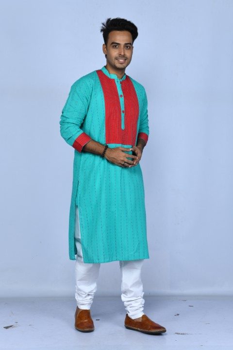 A stylish Sea Green Kurta with Red Yoke  & Cuff Patch  featuring a bold contrast , blending tradition with a modern touch.